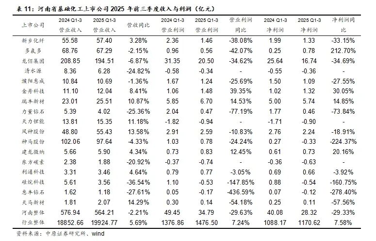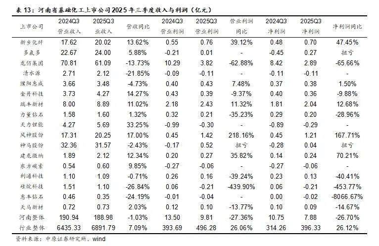2025年三季度,17家河南省基础化工上市公司共实现营业总收入188.98亿元,同比下滑1.03%,实现营业利润9.81亿元,同比下滑27.36%,实现归属于母公司的净利润7.88亿元,同比下滑26.70%。总体上看,三季度河南省基础化工上市公司延续了下滑态势,整体表现弱于行业水平。其中风神股份、建龙微纳、新乡化纤、瑞丰新材和濮阳惠成净利润实现增长,多氟多和神马股份实现扭亏。