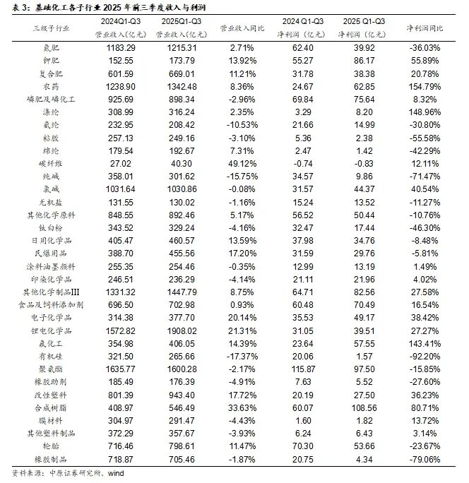 2025年前三季度,基础化工18个子行业的营业收入同比实现增长,18个子行业净利润实现增长,呈现较大分化态势。受益于行业供需格局优化、需求复苏等因素带来的景气提升,农化、氟化工以及新能源相关等子行业收入利润实现较快增长。2025年三季度,多数子行业营收与净利润环比实现改善。