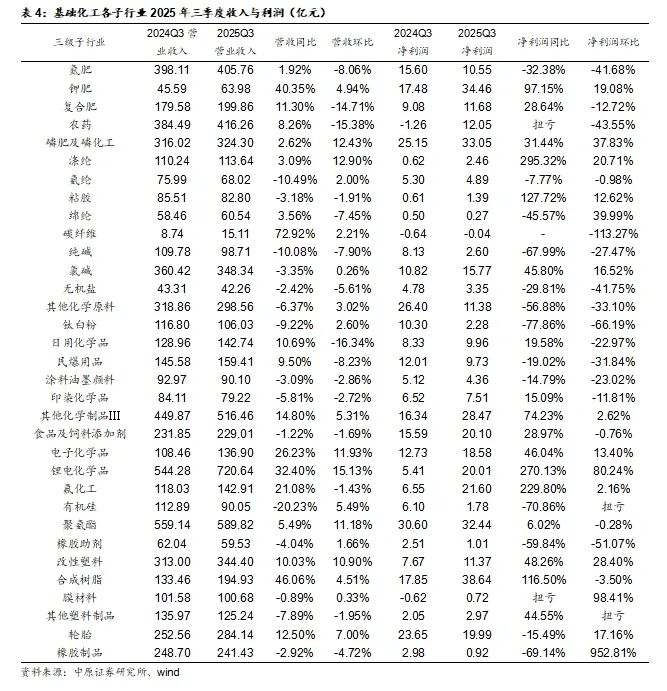 2025年第三季度, 18个子行业营业收入同比实现增长,15个子行业同比下滑。其中碳纤维、合成树脂、钾肥、锂电化学品和电子化学品行业收入增速较快,有机硅、氨纶、纯碱、钛白粉和其他塑料制品行业收入下滑幅度较大。净利润方面,18个子行业净利润同比增长,其中涤纶、锂电化学品、氟化工、粘胶和合成树脂行业增长幅度较大,农药行业实现扭亏,膜材料、钛白粉、有机硅、橡胶制品和纯碱等行业下滑幅度较大。环比来看,18个子行业收入环比增长,锂电化学品、涤纶、磷肥及磷化工、电子化学品和聚氨酯等增速居前,15个子行业环比下滑,日用化学品、农药、复合肥、民爆用品和氮肥等下滑幅度居前。净利润环比总体改善,19个子行业净利润环比提升,14个子行业环比下降,橡胶制品、膜材料、锂电化学品、锦纶、磷肥及磷化工等行业环比提升幅度较大,有机硅、其他塑料制品行业环比扭亏。
