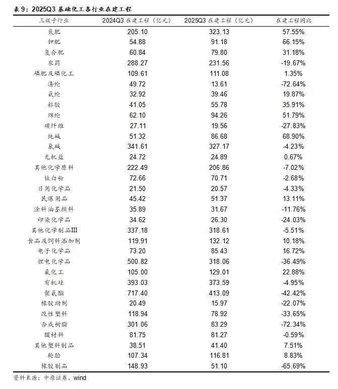 从子行业来看,2025年前三季度基础化工各子行业中,15个子行业在建工程同比增长,纯碱、钾肥、氮肥、锦纶、粘胶等行业在建工程同比增幅较大。从绝对规模上看,聚氨酯、有机硅、氯碱、氮肥、其他化学制品等行业在建工程规模较大。