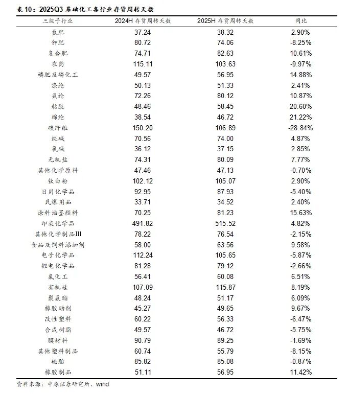 从子行业来看,2025年前三季度基础化工各子行业中,13个子行业存货周转天数同比下降,营运能力有所改善,其中碳纤维、农药、钾肥、其他塑料制品和改性塑料行业等改善幅度较大。20个子行业存货周转天数上升,营运能力有所下滑。其中锦纶、粘胶、涂料油墨颜料、磷肥及磷化工和橡胶制品行业存货周转天数上升幅度较大。