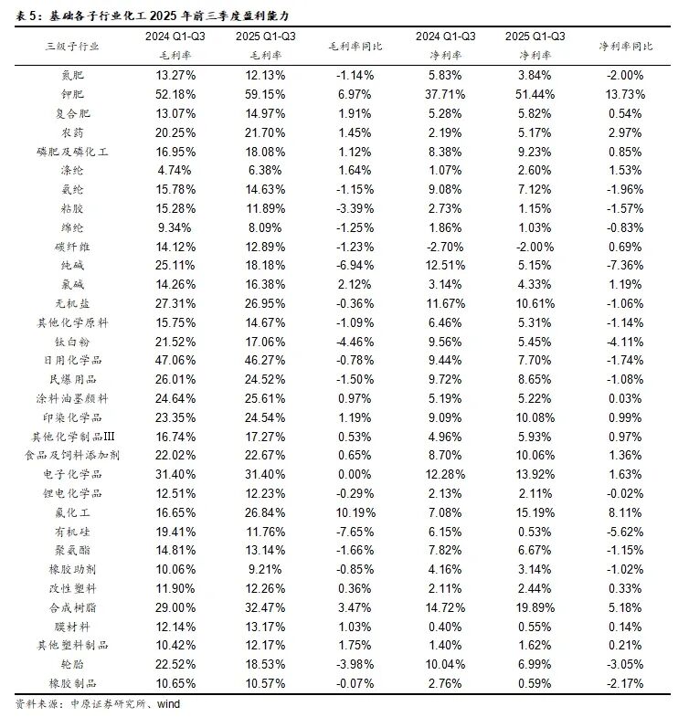 行业盈利能力延续改善。随着行业景气下行,基础化工行业的毛利率、净利率自2022年以来持续下滑。2024年初以来,行业盈利能止跌回升,行业景气底部企稳。2025年前三季度,基础化工行业整体毛利率为17.69%,净利率6.17%,同比均小幅回升。前三季度子行业盈利能力整体分化,氟化工、钾肥、合成树脂、氯碱和复合肥等子行业改善较大。