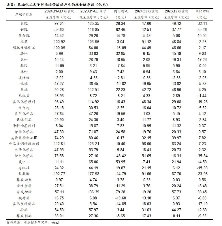 2025年三季度,基础化工各子行业中有20个子行业现金流同比增长,其中氨纶、锦纶、改性塑料、日用化学品和钾肥等行业增长幅度较大,复合肥、橡胶助剂等行业现金流由负转正;13个子行业现金流同比减少,其中锦纶、其他塑料制品、有机硅、锂电化学品和橡胶制品等行业现金流下降幅度较大。