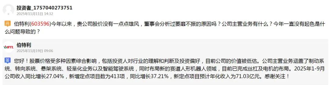 公司主营业务涵盖了制动系统、转向系统、悬架系统、轻量化业务以及智能驾驶系统,同时布局新的赛道人形机器人领域,目前已完成丝杠及电机的布局。2025年1-9月公司收入同比增长27.04%,新增定点项目数为413项,同比增长37.21%,新定点项目预计年化收入为71.03亿元。”