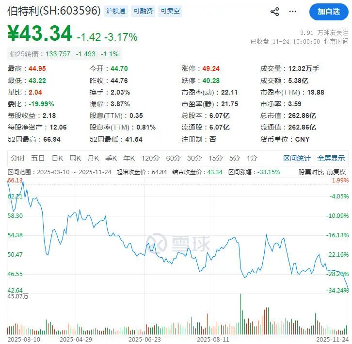 伯特利今年股价走势跌宕起伏,截至11月24日收盘,伯特利报43.34元/股,较年内高点跌超三成。