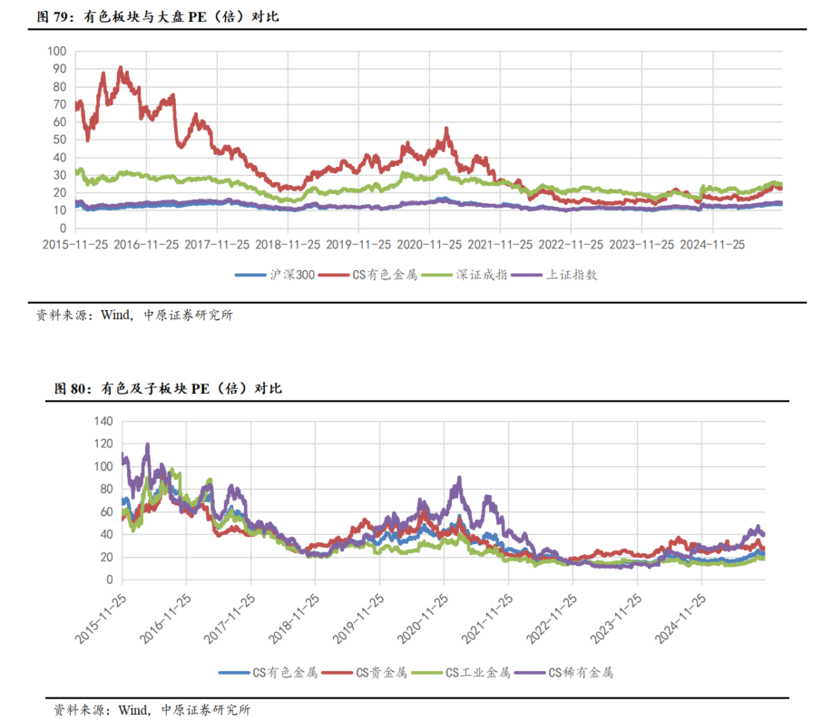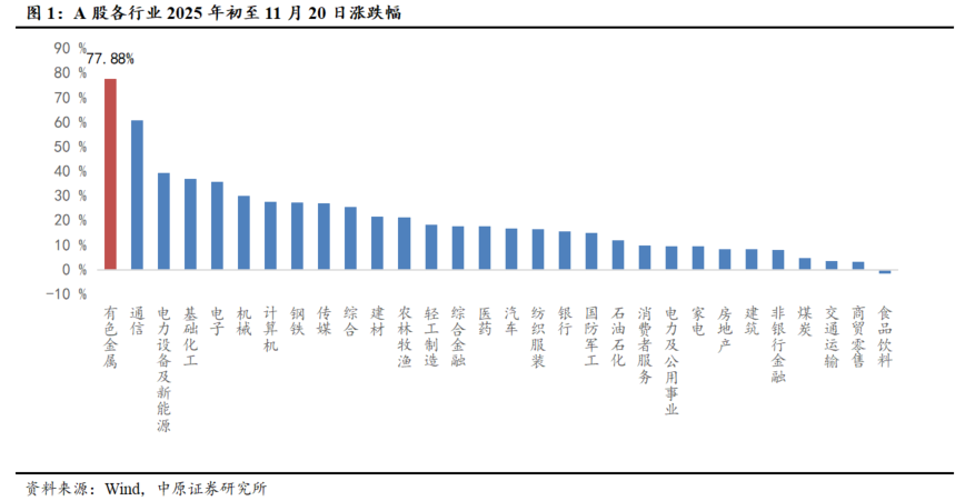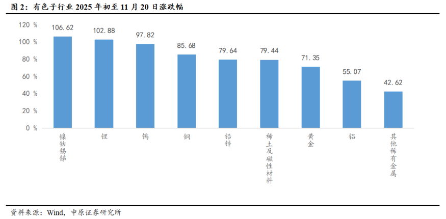 截至2025年11月20日,年初以来,沪深300上涨16.01%,有色板块上涨77.88%,在30个行业中排名第1,表现较好。有色子行业中,小金属领涨,子行业涨跌幅排名为:镍钴锡锑(106.62%)、锂(102.88%)、钨(97.82%)、铜(85.68%)、铅锌(79.64%)、稀土及磁性材料(79.44%)、黄金(71.35%)、铝(55.07%)、其他稀有金属(42.62%)。有色个股方面,120家上涨,5家下跌,1家收平。