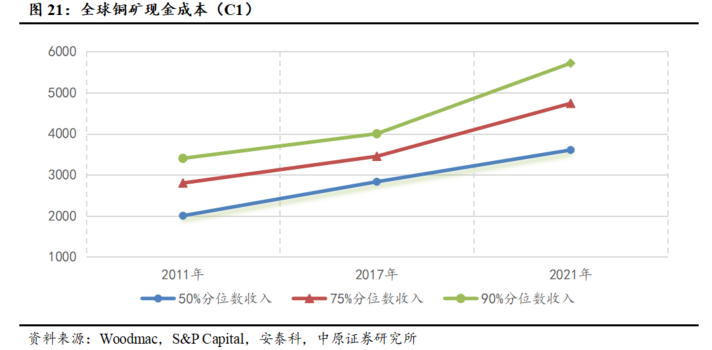 全球铜矿品位呈下降趋势,推动铜矿现金成本不断升高。由于大型优质铜矿新发现稀缺、新投产矿山原生品位普遍偏低、存量矿山老龄化加剧等问题,铜矿开采品位下滑明显。根据Bloomberg,全球铜矿平均品位已由2003年的0.85%下降至2022年的0.42%。在矿石处理技术未取得突破性进展的背景下,矿石品位下降直接导致单位矿石处理量增加、选矿难度加大,进而推高开采环节的现金成本,叠加通胀等因素带来的人工、能源、耗材等成本上升,以及环保合规要求趋严带来的额外支出,全球铜矿综合生产成本持续上行。根据安泰科数据,2021年,铜精矿90%分位现金成本提升至5718美元/吨。铜矿现金成本的持续上行将支撑铜价中枢上移。