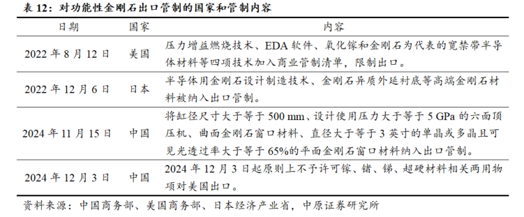CVD金刚石开发潜力巨大,中美日将高端金刚石纳入出口管制名单。人造金刚石不仅可应用于工业领域,凭借其高热导率、宽禁带、高载流子迁移率、高绝缘性、光学透过性、化学稳定性与抗辐射性,还可作为高新技术材料应用于半导体、光学、量子技术等新兴领域。考虑到金刚石具有高尖端产品战略属性,中美日将高端金刚石纳入出口管制名单,也从侧面反映出功能性金刚石开发潜力巨大。