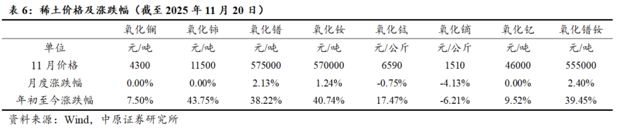 稀土氧化物价格普遍较年初有所上涨。受稀土出口管控影响,稀土价格普遍上涨。截至2025年11月20日,氧化镧、氧化铈、氧化镨、氧化钕、氧化铽、氧化镝、氧化钇、氧化镨钕较年初以来涨幅分别为7.50%、43.75%、38.22%、40.74%、17.47%、-6.21%、9.52%、39.45%。