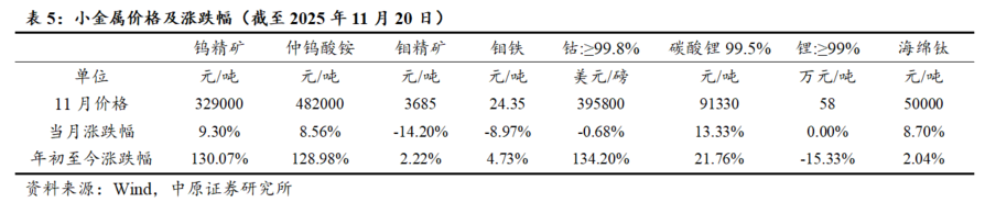 小金属价格普遍上涨,锂价格有所下滑。截至2025年11月20日,金属锂(锂≥ 99%)价格年初以来下降15.33%,但碳酸锂价格上涨21.76%;钨精矿与仲钨酸铵价格分别较年初上涨130.07%和128.98%;钼精矿和钼铁价格较年初以来分别上涨2.22%和4.73%。钴、海绵钛价格较年初以来分别上涨134.20%和2.04%。