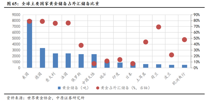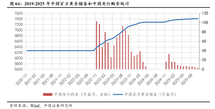 我国黄金储备占比相较国际主要经济体仍存在显著提升空间。横向对比来看,截至2025年三季度,全球黄金储备占外汇储备的平均比重为22.4%,而同期中国黄金储备占比仅为8.02%。与发达经济体相比,这一比例明显偏低,美国黄金储备占比达78.73%,德国为78.63%,法国为75.86%。考虑到黄金储备作为国家储备资产多元化配置和保障资产安全的重要工具,其战略意义持续凸显,当前较低的占比水平意味着我国黄金储备规模存在较大的增长潜力。我们认为人民银行增持黄金或将成为长期趋势,为黄金价格中枢的进一步抬升提供支撑。