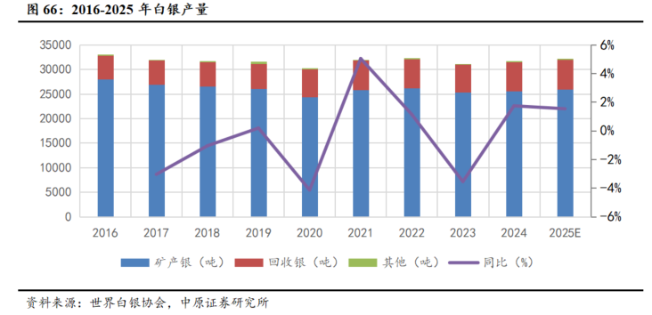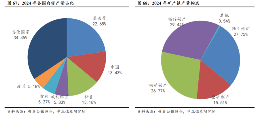 全球白银供给有限,供给增速较低。白银的全球供给主要由矿产银和回收银组成。从历史趋势看,2016-2020年白银产量逐渐下滑,2021年后整体供应格局转为呈小幅波动。根据世界白银协会预测,2025年全球白银供给量约32056吨,同比小幅增长1.5%。从地区来看,银矿产量主要集中在美洲地区,2024年,全球白银矿产排名前三的国家为墨西哥、中国、秘鲁,产量占全球产量比重分别为22.65%、13.43%和13.18%。