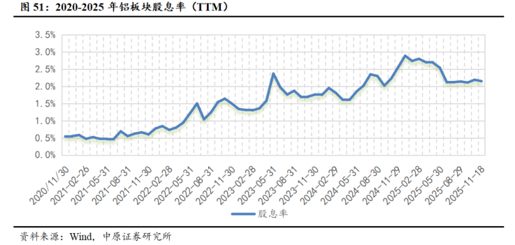 电解铝板块红利属性凸显。一方面,在电解铝行业盈利持续向好的背景下,企业现金流保持充裕,为提升分红能力奠定了坚实基础。另一方面,国内对电解铝新增产能实施严格管控,推动行业进入去杠杆周期,企业债务结构不断优化,分红意愿显著增强。铝板块股息率从2021年初的0.58%逐步升至2025年11月的2.15%,红利属性凸显。