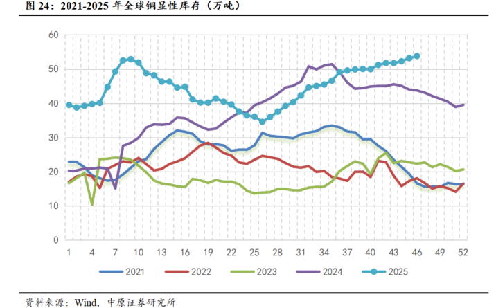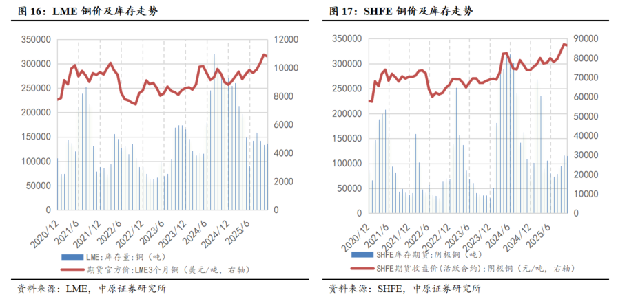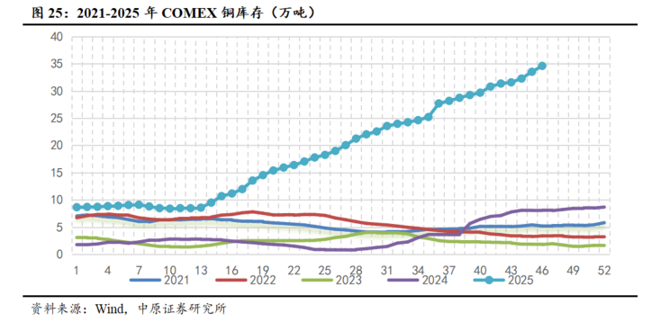 全球铜库存累库明显。截至2025年11月14日,COMEX+LME+上期所全球显性库存合计约53.79万吨,整体库存水平持续攀升。一方面由于下游需求进入淡季,表现持续偏弱,另一方面在美国依据“232条款”调查可能对进口铜加征关税的预期下,国际贸易商持续将货源转往美国,叠加COMEX铜库存的显性化,COMEX铜库存持续向上,从1月的约8.9万吨升至11月中的34.59万吨。