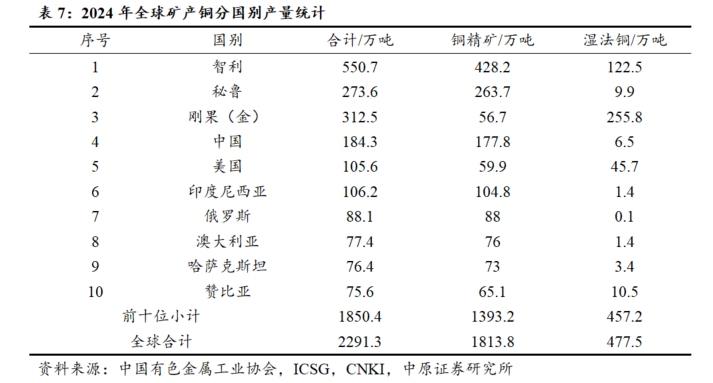 中国是全球最大的精炼铜生产国和消费国,对海外矿产资源依赖度较高。2024年,中国精炼铜产量达到1364万吨,约占全球精炼铜总产量的49%;同期铜加工材产量2350万吨,位居世界首位,大规模的铜产品生产有力地支撑了新能源、新一代信息技术等战略性新兴产业发展。从消费端来看,受新能源基建扩张与AI技术驱动的铜需求增长拉动,2024年中国铜消费量1599万吨,占全球58.5%。然而根据地勘数据,中国铜矿资源匮乏且禀赋不足,中国探明铜矿储量仅约占全球的4%;2024年,中国铜精矿产量177.8万吨,仅占全球9.80%;同期中国进口铜精矿达2811万吨,铜精矿对外依存度高达94%。