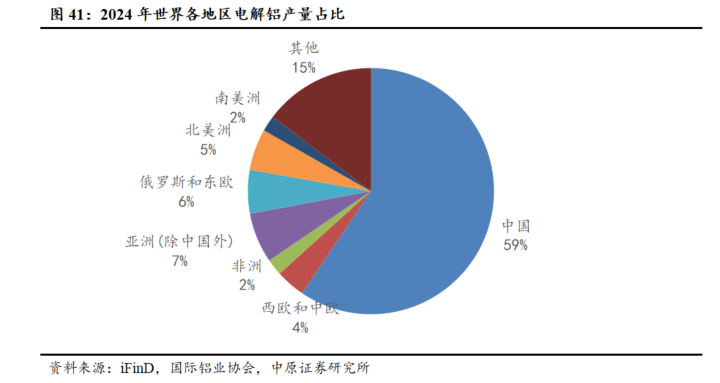 海外电解铝产量相对稳定,中西欧停产贡献减量。国内电解铝产量占全球比重逐年提升,2024年中国电解铝产量占全球产量59%。近年来海外电解铝产量相对稳定,2024年海外产量占全球比重约41%。受2021年以来能源价格大幅上涨影响,欧美地区较多铝厂因成本压力被迫减产或关停,尽管2024年部分产能有所复产,但当前产能规模较2021年仍存在较大幅度的收缩。