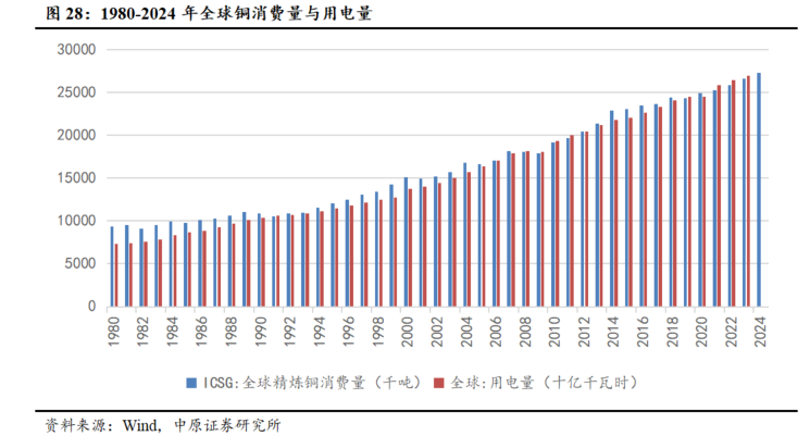 铜与全球用电总量成正相关关系。铜作为当前技术条件下最主要的导电材料,其消费量与全球用电总量呈现出紧密的正相关关系。随着全球电气化进程的持续推进,这一趋势愈发显著。自1980年以来,全球铜消费量的增长速度基本与电力消费增速保持一致,凸显了铜在支撑能源转型和电力基础设施扩张中的不可替代性。