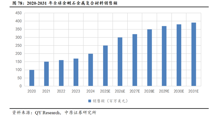 2024年全球金刚石复合材料市场规模约2亿元。根据QYResearch测算,2024年全球金属金刚石复合材料市场规模为199.20百万美元,预计2031年将增长至381.43百万美元,年复合增长率(CAGR)为10.24%。其中中国市场2024年市场规模为60.82百万美元,约占全球的30.53%,预计2031年将达到116.83百万美元,年复合增长率(CAGR)为10.36%。