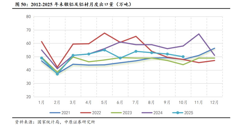铝材出口好于预期。2025年1-10月份,未锻轧铝及铝材出口量502万吨,同比下降8.39%,降幅小于预期。尽管受去年11月铝材出口退税政策取消等因素影响,出口总量出现回落,但实际降幅低于预期,我国铝外贸在外部环境变化下仍具备一定韧性。