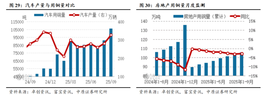 房地产行业用铜量同比下降。1-9月份,全国房地产开发投资67706亿元,同比下降13.9%;其中,住宅投资52046亿元,下降12.9%。根据监测的数据显示,2025年1-9月房地产行业用铜量约为105.55万吨,同比下降2.86%。