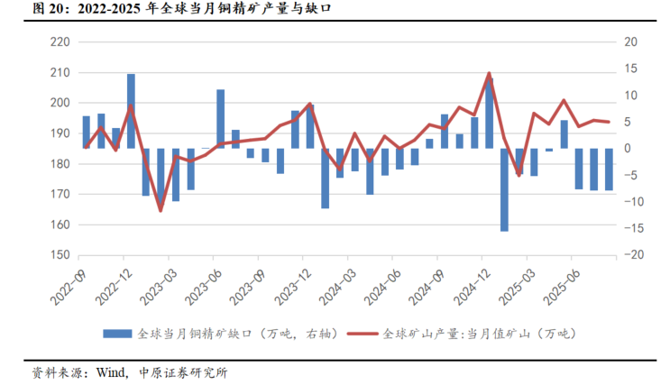 2025年前8个月全球矿山铜产量同比提升,铜精矿缺口进一步扩大。根据ICSG数据,2025年1-8月全球矿山铜产量为1534.9万吨,同比增长3.17%。尽管产量有所提升,但仍未能完全满足精炼铜生产需求。根据测算,1-8月全球铜精矿缺口达44万吨,较2024年同期的39.9万吨扩大10.28%。随着铜精矿库存的进一步消耗,铜的供给波动性将增强。