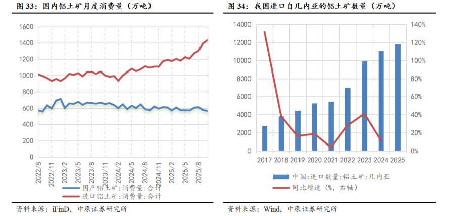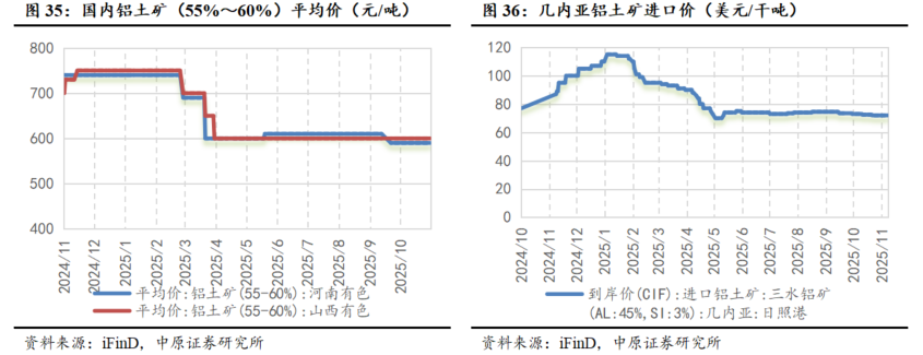 进口铝土矿价格下降,几内亚铝土矿发运量同比显著提升。根据海关总署数据,2025年1-9月国内自几内亚进口铝土矿1.18亿吨,同比增加28.72%。根据iFinD,截至11月17日,几内亚铝土矿单价为71.5美元/干吨,月环比下降1.38%;河南铝土矿(55%-60%)价格为590元/吨,与10月价格一致。
