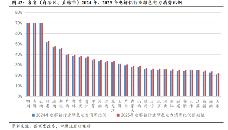 绿电铝电力消费指标不断提高,2025年要求绿电铝占比不低于25.2%。根据中国有色金属工业协会统计,我国电解铝企业绿电使用比例已从2015年的13.4%已提升到2024年的25.2%,绿电铝年产量超过1100万吨。国家能源局指出2025年全国电解铝行业绿色电力消费比例至少应达25.2%,且对重点区域实施差异化要求:四川、青海、云南的电解铝行业绿色电力消费比例至少应达70%。根据我们测算,国家发改委、能源局给出的2025年电解铝行业绿色电力消费比例目标较2024年提高0.82%。