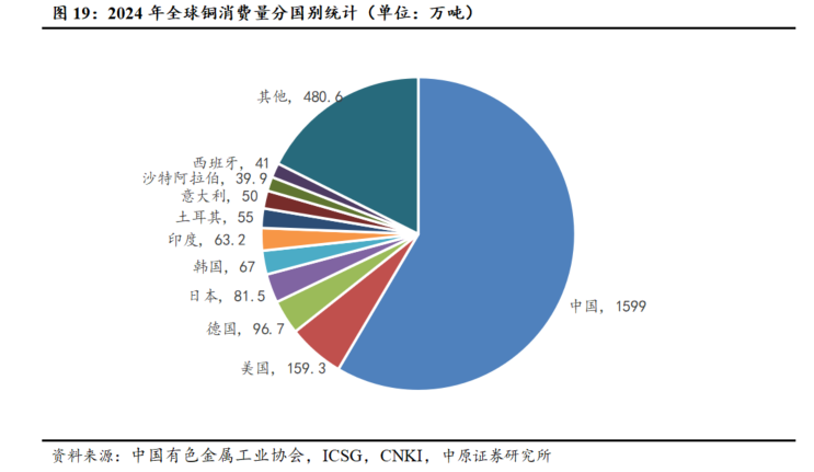 电力领域是铜下游应用最大需求来源。铜的高导电性、耐用性和成本效益使其广泛用于电力网基础设施。同时,在能源转型趋势下,铜也成为电动汽车、太阳能光伏板和风力发电机组中的关键材料。2024年国内铜的下游消费主要集中在电力、家电和交通三大领域,其需求占比分别为44%、20%和9%,凸显了电力领域在铜消费中的核心地位。
