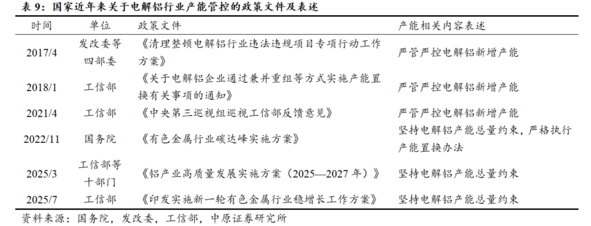 政策坚持电解铝产能总量约束,严格控制新增产能。近年来,国务院、工信部等有关部门发布的涉及电解铝产能相关政策文件,表述均为坚持供给侧约束。电解铝行业作为供给侧结构性改革的成功案例,已步入以高质量供给驱动行业发展的阶段。我们认为产能总量管控政策将保持高度的连续性和稳定性,国内电解铝产能上限放开的几率较低。