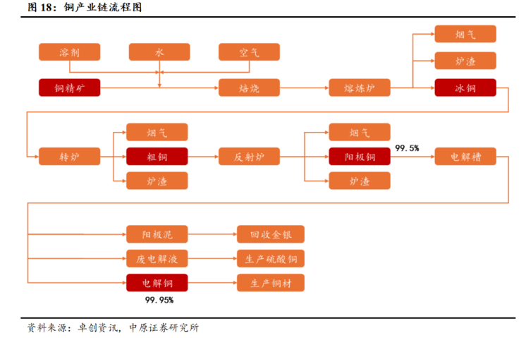 铜产业链主要包括上游的铜矿石采选及废铜回收、中游的冶炼环节以及下游的加工和应用环节。上游环节为铜矿石的勘探、开采和选矿。选矿方法则分为浮选与湿法,全球80%以上的铜矿采用浮选方法。中游环节主要是将铜矿石或废铜通过电解、熔炼、精炼等步骤提炼出电解铜。下游环节主要是将电解铜通过压延、锻造等多种方式加工成各种形态的铜材,如铜管、铜棒、铜杆、铜线、铜箔等,并进一步加工成铜制品,广泛应用到电力、家电、建筑、机械、电子器件等领域。