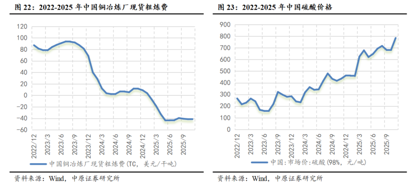 中游铜冶炼环节整体承压,利润向矿端转移。铜冶炼厂利润主要来源于铜矿加工费(TC/RC)和硫酸、金、银等副产品收益。中国现货粗炼费TC自2月跌破零之后,持续下跌,从1月的3.65美元/干吨跌至-41.81美元/干吨。一方面由于全球铜精矿供应偏紧,市场竞争加剧,矿企在定价过程中主动权增加,另一方面,随着近年来冶炼厂产能增速快于矿端产能增速,冶炼厂议价权逐渐减弱。因此,加工费持续下降,冶炼厂维持在低利润或亏损状态,利润向矿端转移。我们认为在低利润的情况下,铜冶炼厂可能减产,开工率将进一步降低。