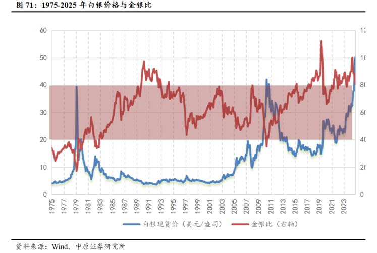 白银价格弹性突出。白银作为兼具工业属性与货币属性的贵金属,在流动性宽松周期中展现出更强的价格弹性。截至2025年11月,金银比已从2025年5月份的100附近回落至80左右,但相较于长期平均水平来看,仍存在向下修复的空间。