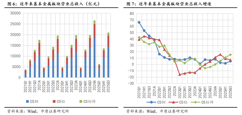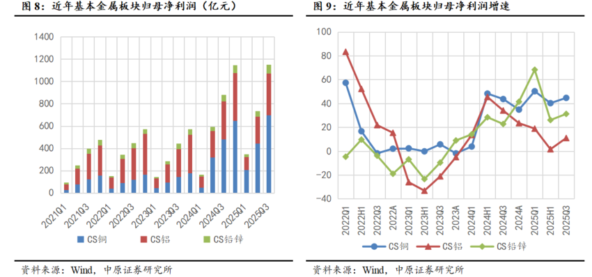 铜板块营收稳步提升,盈利同比增速实现快速增长。2025Q3铜板块营收为14438.56亿元,同比增长5.05%;归母净利润为699.06亿元,同比增长44.60%。