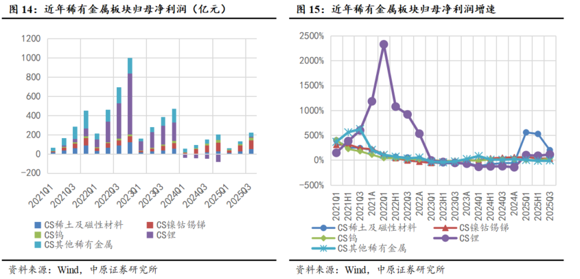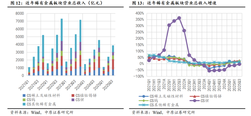 稀土板块营收同比增速涨幅扩大,盈利增速显著提升。2025Q3稀土及磁性材料板块营收为799.34亿元,同比增长12.47%;归母净利润为49.98亿元,同比增长200.11%。其中,镍钴锡锑板块营收同比增速由负转正,盈利改善明显。2025Q3镍钴锡锑板块营收为1308.70亿元,同比增长23.79%;归母净利润为93.06亿元,同比增长25.45%;钨板块营收同比增速由负转正,三季度盈利增速显著增强。2025Q3钨板块营收为502.50亿元,同比增长20.38%;归母净利润为28.70亿元,同比增长28.58%;锂板块营收同比增速降幅收窄,盈利同比增速大幅提升。2025Q3锂板块营收为420.38亿元,同比增长-3.62%;归母净利润为6.67亿元,同比增长113.47%;其他稀有金属板块营收同比增速稳步增长,盈利能力下降。2025Q3其他稀有金属板块营收为866.79亿元,同比增长14.91%;归母净利润为43.19亿元,同比下滑6.47%。