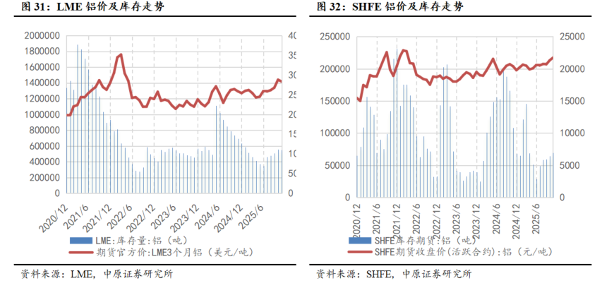 2025年1-10月,国内铝价呈现震荡上行格局。1-2月在宏观政策利好支撑下,铝价维持高位震荡态势;3月份起,受中美对等关税政策冲击,商品市场整体走弱,叠加氧化铝成本下降因素,铝价开始回落;随后在中美贸易关系缓和、地缘政治紧张局势缓解的背景下,市场情绪逐步修复,铝价逐步修复。10月美联储降息25bp并停止缩表,中美元首会晤释放积极信号,贸易紧张缓和,以及采暖季西北铝锭外运受限、“十五五”规划中新能源、特高压等领域投资预期,推动电力用铝需求增长沪铝“偏强运行、重心上移”。截至10月31日,SHFE电解铝期货收盘价为21300元/吨,LME电解铝期货收盘价为2880美元/吨,国内电解铝现货报价为21290元/吨。