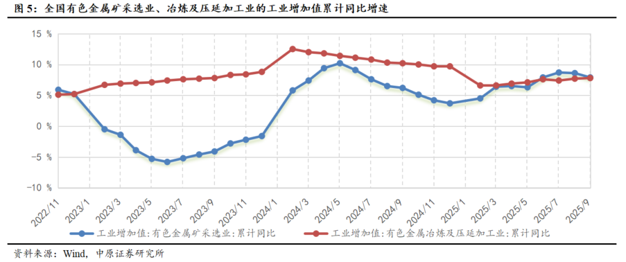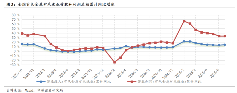 行业上游营收实现增长,营业利润同比显著提升。2025年1-9月,有色金属矿采选业实现营业收入达3069.70亿元,同比增长14.20%,营业利润达932.80亿元,同比增长33.30%。