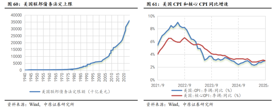 美国债务上限上调,财政赤字进一步扩张。7月4日,特朗普正式签署《大美丽法案》,法案将提将联邦债务上限提高5万亿美元至41.1万亿美元,并推升未来财政赤字水平。法案主要内容包括多项税收减免措施,同时削减社会福利支出并压缩清洁能源补贴,此外还扩大边境安全和国防支出。根据美国国会预算办公室(CBO)测算,2025财年美国联邦预算赤字约为1.8万亿美元,而《大美丽法案》将在2025至2034年间使联邦赤字总额增加约3.4万亿美元。