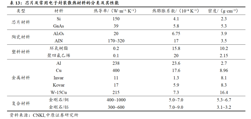 金刚石/铜是下一代散热方案的备选材料体系。金刚石/铜复合散热传统的散热组件常用Cu和Al及其合金材料,其热导率不超过400W/m·K。特别是对于高“热点”问题,则难以在一定厚度内同时保证温度的均匀扩散和导出,从而带来体积和重量的增加,不利于小型化和轻量化设计。金刚石金属基复合材料兼具了金刚石的高导热性、低密度、低热膨胀系数等优异特性,且与新一代芯片具有良好的热匹配性能。其中铜基体本身热导率较高,化学稳定性好。再结合上增强体金刚石的高热导率和低热膨胀系数,金刚石/铜复合材料是高热流密度散热应用中较具可行性和发展潜力的材料体系。目前,人工智能发展带来的高散热需求而受到关注,可能推动金刚石从“可选”转变为“必选”材料。