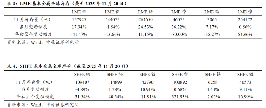 LME铅、镍和SHFE铜、锌、镍库存较年初上涨。截至11月20日,LME铅库存较年初以来上涨11.15%;LME镍库存年初以来上涨54.96%; SHFE铜库存较年初以来上涨31.54%;SHFE锌库存年初以来上涨321.93%; SHFE镍库存年初以来上涨16.99%。