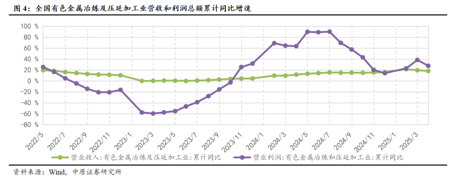 行业中下游营收盈利双增长,盈利同比增速有所放缓。2025年1-9月,有色金属冶炼及压延加工行业营业收入达70910.80亿元,同比增长14.60%,营业利润达2387.70亿元,同比上涨14.60%。