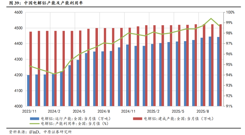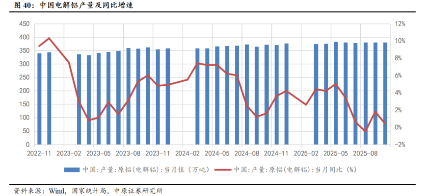 截至2025年10月,全国电解铝建成产能与运行产能分别为4523.2/4443.4万吨,其中建成产能触顶4500万吨天花板,产能利用率同步提升至98.7%,为历史相对高点。从产量表现看,随着建成产能与运行产能规模的增加,国内电解铝产量持续提升,2025年1-10月国内电解铝产量3775万吨,同比增加2.0%。