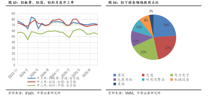 2025年房地产市场同比表现继续降温,铝型材需求减弱。铝合金被广泛应用于门窗框架、幕墙、屋顶以及隔墙等建筑结构和装饰设计中,特别是在房屋竣工阶段对铝的使用量最为密集。1-9月份,全国房地产开发投资67706亿元,同比下降13.9%,房屋竣工面积31129万平方米,下降15.3%。根据富宝资讯数据,2025年1-9月房地产市场用铝量为706.73万吨,同比去年减少4.03%。房地产市场延续收缩状态,特别是竣工面积同比下滑对铝行业需求形成了拖累。受地产投资与竣工持续走弱影响,建筑用铝尤其是铝型材的短期需求仍将承压。