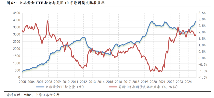 投资者配置黄金ETF的意愿显著增强。黄金ETF持仓量与美债10年期实际利率呈现负相关关系。2025年以来,随着美联储降息预期不断强化,实际利率逐步回落,同时叠加通胀对冲与地缘政治避险等多重需求,世界黄金协会数据显示,2025年第三季度全球黄金ETF总持仓大幅增加222吨,同比增幅达134%,单季度资金流入规模约260亿美元。