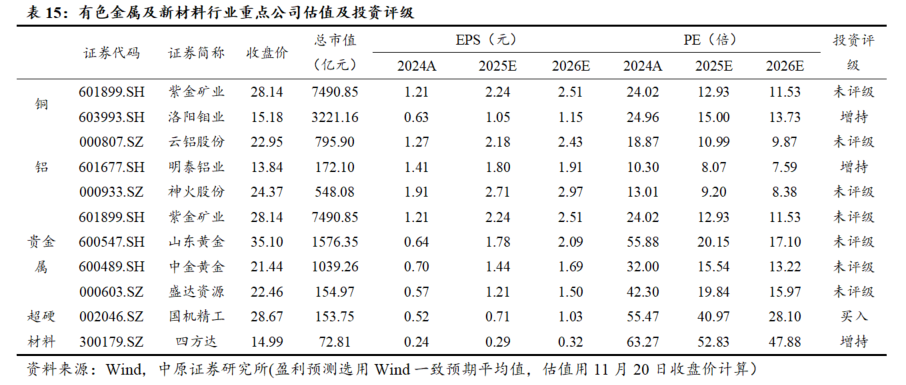 投资建议:截至11月20日,有色板块PE(整体法,TTM,剔除负值,下同)为22.62倍,贵金属板块PE为27.85倍,工业金属板块PE为18.42倍,稀有金属板块PE为40.40倍。受到美联储进入降息周期、国内一系列利好政策施放显效、经济保持向好态势,海内外对有色金属需求增加,我们维持有色金属及新材料行业评级为“强于大市”,建议关注铜、铝、黄金和超硬材料板块。