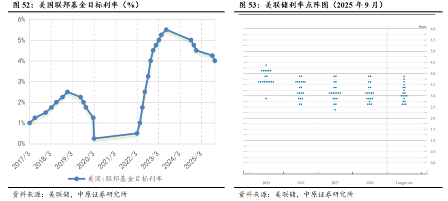 利率降低对黄金起支撑作用。在高债务、高利率影响下,美国政府偿还利息压力较大,同时经济衰退风险提高。在此背景下,降息空间逐渐打开。2025年9月、10月美联储各降息25个基点,根据美联储点阵图显示,2026年仍有降息两次共50个基点的空间。随着降息通道开启,黄金作为避险资产和无利率商品的吸引力相对上升。此外随着美国通胀的“拐头向上”,对黄金等抗通胀商品产生利好。
