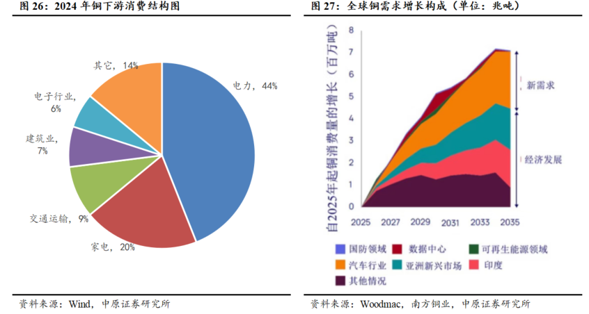 受数据中心、新能源汽车快速发展等领域拉动,铜需求将持续增长。根据Woodmac预测,世界铜需求量到2035年增长至4270万吨,较2025年增长24%。从需求结构来看,电动汽车和数据中心是推动铜需求增长的关键领域,其远期年需求量预计分别达到430万吨和110万吨。