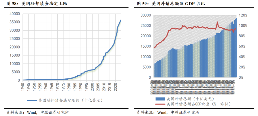 债务上限提升与赤字扩大,加剧对美国国债信用担忧。随着美国政府负债规模快速增加,直接导致利息支出也相应增多。美国财政部数据显示,2024年联邦政府债务利息支出约1.1万亿美元,利息支出首次超过1万亿美元,较2023年增长29%。在债务上限提高后后,财政赤字扩张与不断积累的国债规模进一步加重了偿债压力,引发偿还担忧。截至2025上半年,美国外债占GDP比重达到93.83%。因此,美元信用体系正面临结构性压力,为降低对单一货币的依赖,黄金作为储备资产的重要性逐步显现。