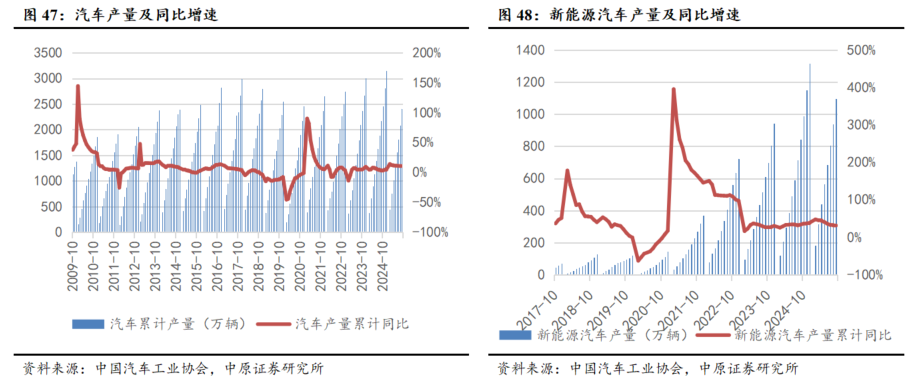 新能源汽车高景气拉动车用铝合金需求。根据汽车工业协会的数据,2025年1-9月,国内汽车产量为2433.3万辆,同比增长13.3%。其中新能源汽车产量为1124.3万辆,同比增长35.2%。新能源汽车新车销量达到汽车新车总销量的46.1%。2025年9月份,国内汽车市场用铝量为52.43万吨,环比上涨16.38%,同比提升35.84%。我们认为汽车行业消费平稳增长,特别是新能源车产销维持高景气度,对铝需求形成有效补充。