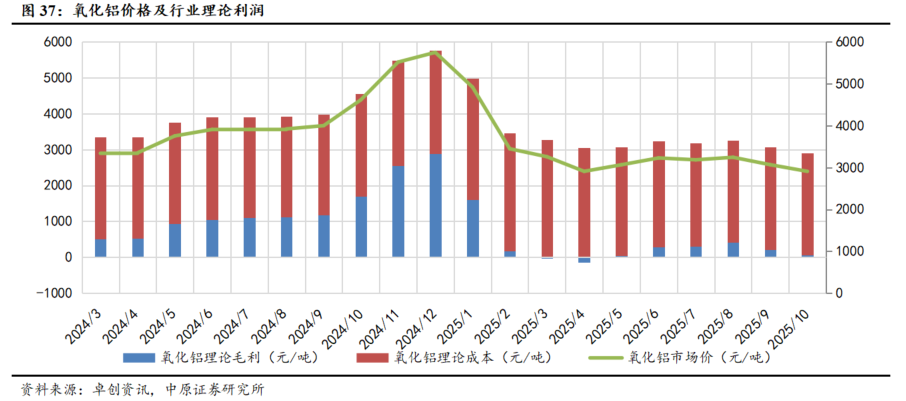 氧化铝供应过剩格局延续,价格较年初大幅下降。2025年是国内氧化铝产能投产的“大年”,国内新增产能持续增加。根据有色金属工业协会统计,我国氧化铝新增产能1140万吨,海外新增产能460万吨(主要集中在印度、印尼两国)。同时伴随原料端铝土矿供应趋于宽松,价格同步下行;叠加印尼等海外新项目稳定产出,海外市场供应增加,氧化铝价格下跌。截至10月31日,根据卓创资讯,氧化铝价格为2905.89元/吨,较年初下降50.60%。从利润来看10月氧化铝理论利润为68.61元/吨,行业呈现微利状态。