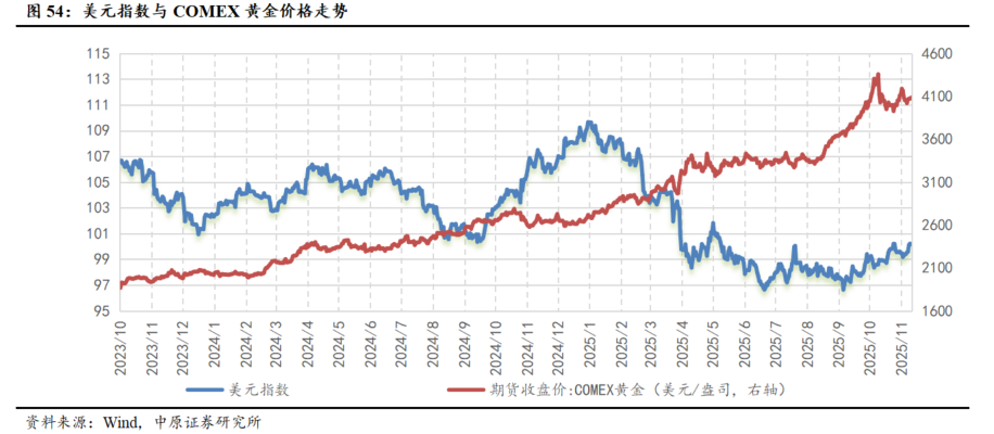 多重因素推动下,黄金价格呈现震荡上行格局。2023年7月开始美国停止加息,2024年9月开启降息周期,截至2025年11月15日已累计降息125个基点。其中2025年9月和10月各降息25bp。根据美联储点阵图显示,年内或仍有1次降息,高利率环境对黄金价格的压制效应正逐步减弱。与此同时,全球主要央行货币政策也逐步转向宽松,进一步强化了黄金的配置价值。年初以来,在美联储降息预期持续发酵、通胀预期加大、地缘政治风险延续、全球央行加速增持黄金储备、投资者避险因素增加等多重因素推动下,国际黄金价格(以COMEX黄金期货收盘价计)从年初的2644.20美元/盎司上涨至11月18日4063.40美元/盎司,年内累计涨幅达53.67%。